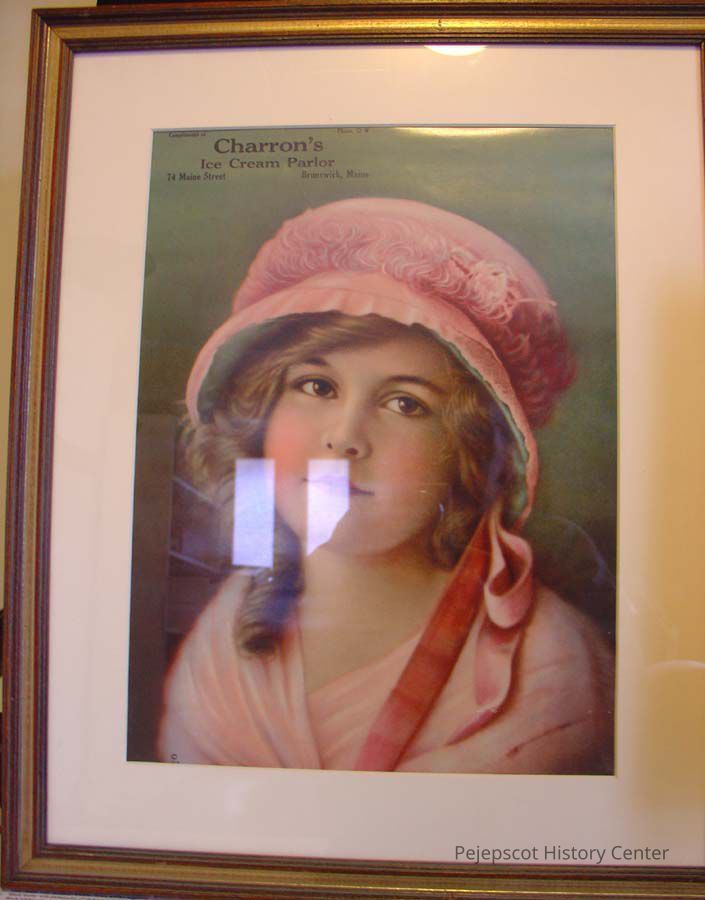 A framed colored advertising poster for Charron's Ice Cream Parlor, 74 Maine Street, Brunswick. Charron's Ice Cream Parlor was operated by Charles Charron for a few years. The poster was copyrighted 1919.Lexicon