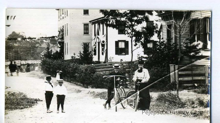 B/W photo of children and bicycles on Swett Street, Brunswick, Maine, near Mill Street. Photo includes a girl (possibly woman) and boy with bicycles, and two boys. Based on the 1901 Sanborn map of Brunswick, this view appears to be of Swett Street near its intersection with Mill Street. The swinging bridge is visible in the background. Dated ca. 1900.Lexicon