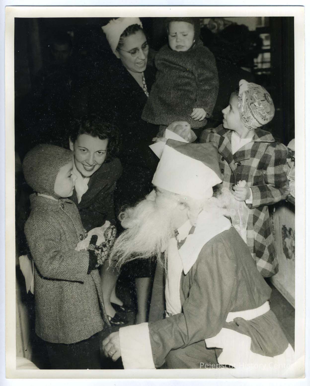 Children and their mothers meeting Santa at the Verney Mill Christmas party. The pictures shows Gabrielle Menard Favreau holding a baby and standing next to Dolores Favreau. In front Laurette Charron bends over her child who is facing Santa. Undated
