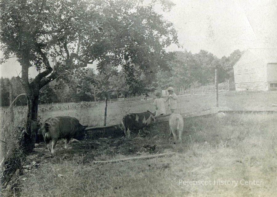 A B/W photograph of two children feeding three enclosed pigs. Undated.