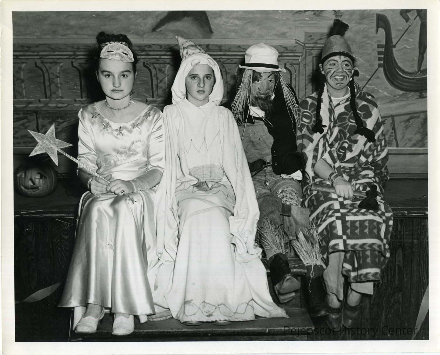 Four young people in costumes are seated on what looks like a stage. The two children on the right are unidentified. The two girls at left are Jacqueline Moreau and Pauline Menard. Undated