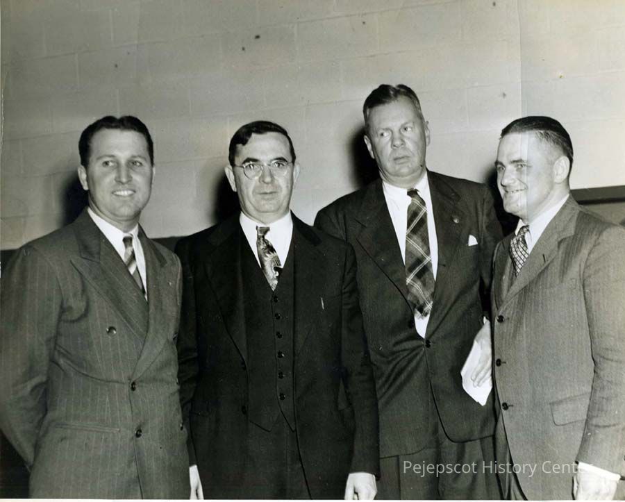 A B/W photo of the committee for a children's party at the Cabot Mill. Handwriting on back of photograph reads; "Committee for children's party / Jimmy Pinette / Blackie Lachance / Fred Olmstead / Blackie Lavesque." Dated 1930.