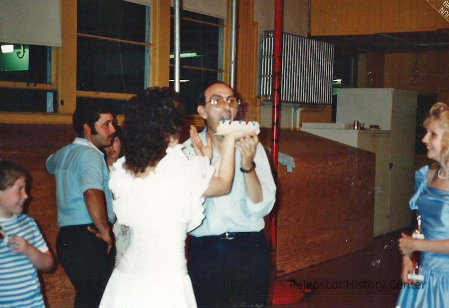 A color photograph of Chressie Gagne feeding cake to Gene Gagne, while Gene awaits the push of the cake into his face while Michelle Matheson looks on.