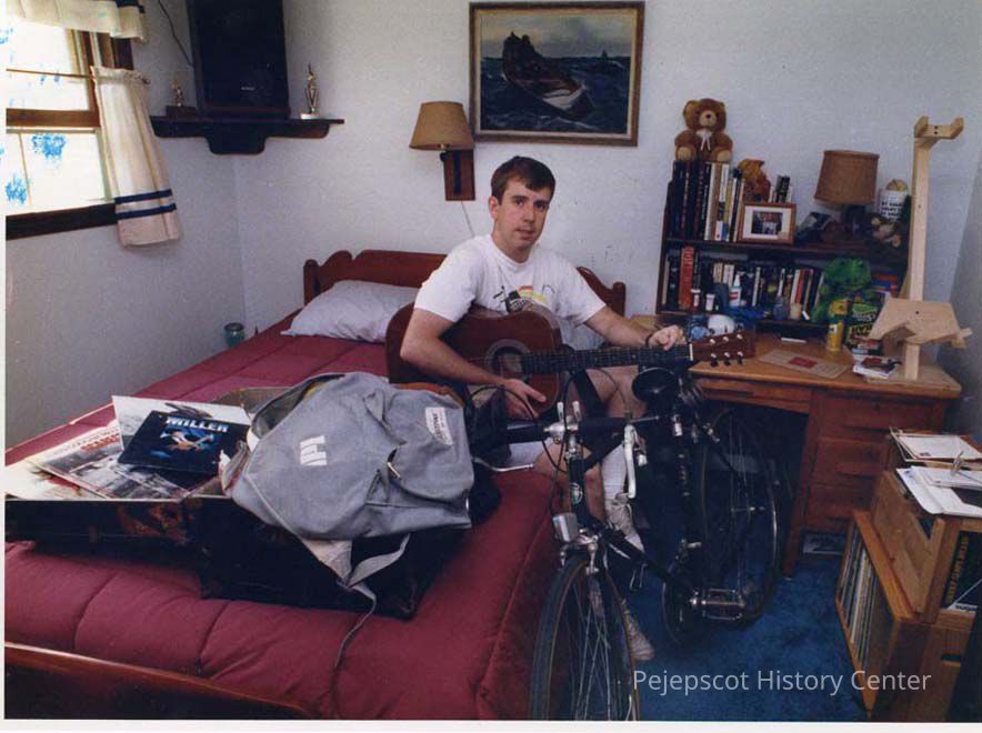 An undated color photograph of Chris Talbot playing a guitar in Topsham, Maine.