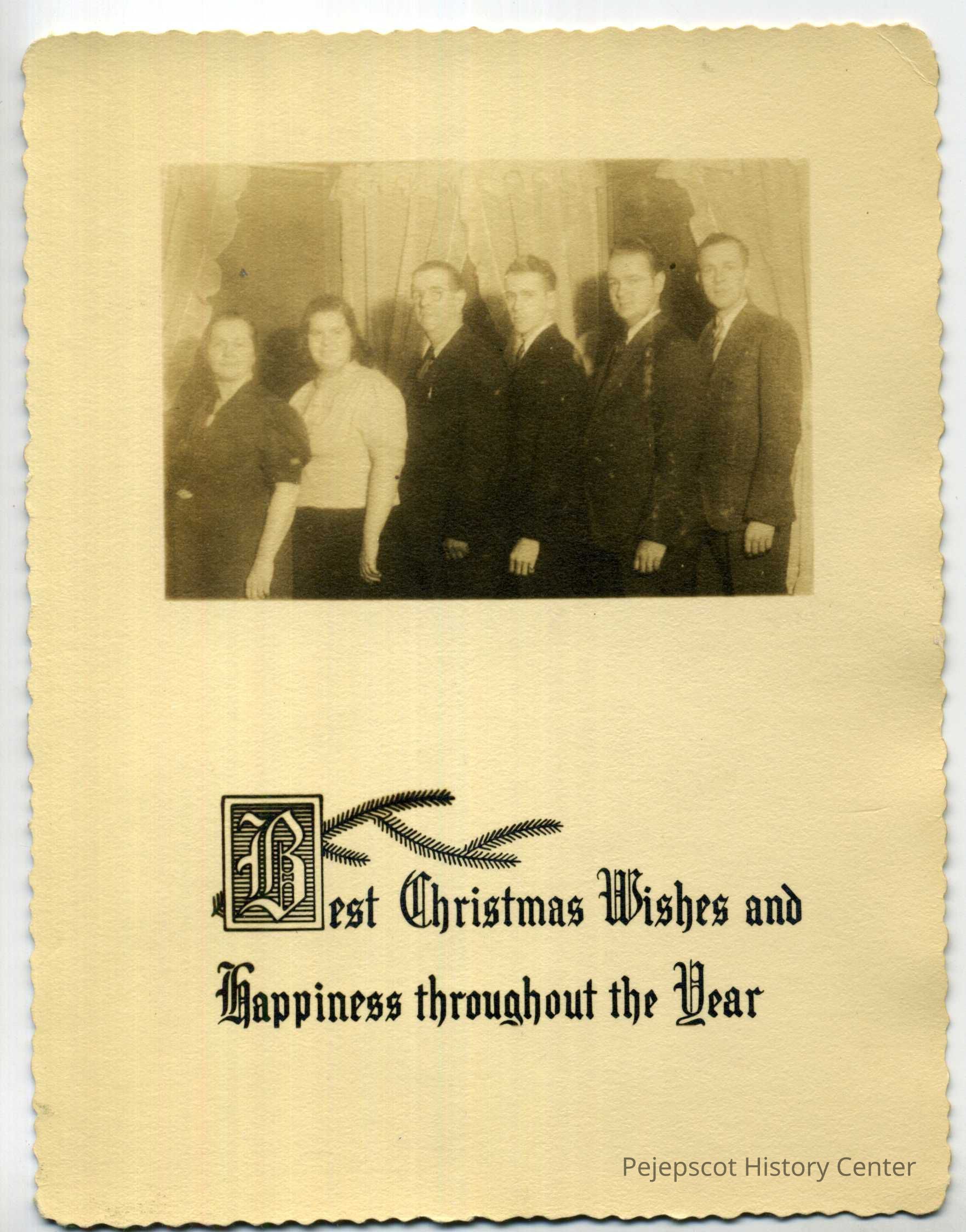 An undated black and white photograph of an undated Christmas card. There is a photograph of a French family (l-r Winifred, Beverly, John, Sumner, Russell and Malcolm) on the top and a printed greeting on the bottom: "Best Christmas Wishes and Happiness throughout the Year."