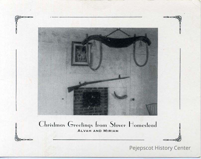 An undated Christmas card containing the words "Christmas Greetings from the Stover Homestead, Alvah and Miriam" and a black and white photograph of the fireplace of the home.