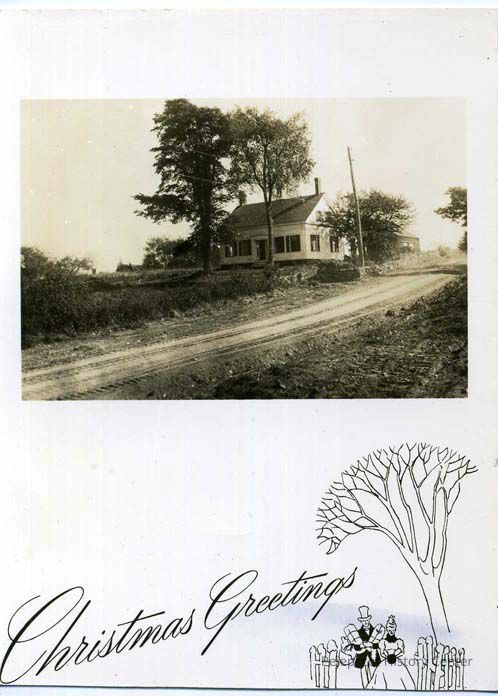 A Christmas card from the Stovers, containing a black and white photograph of the Stover Homestead and the words "Christmas Greetings" plus a sketch of a well-dressed man and woman going through a gate, and a tree. The man is hollding packages. The original description says it is from Frank Bailey.