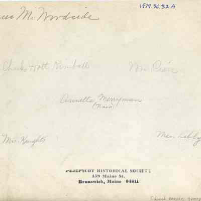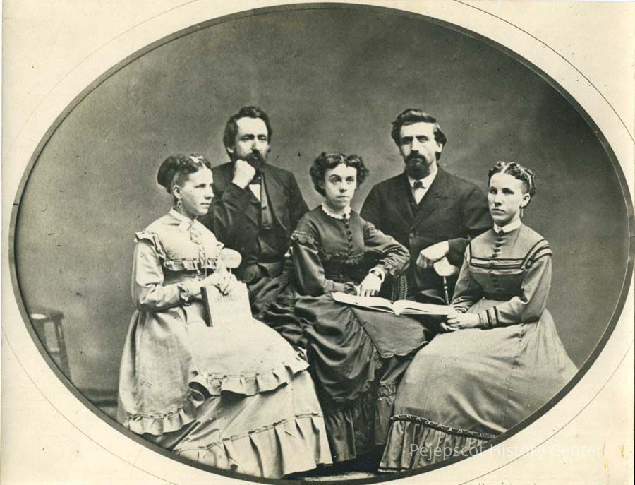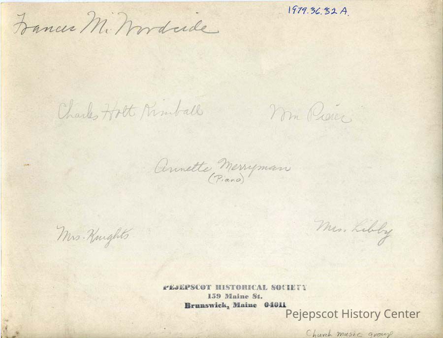 A black and white photograph of a church music group featuring Charles Holt Kimball, Wm. Pierce, Annette Merryman (on piano), Mrs. Knights & Mrs. Libby. Dated ca. 1875.Collection