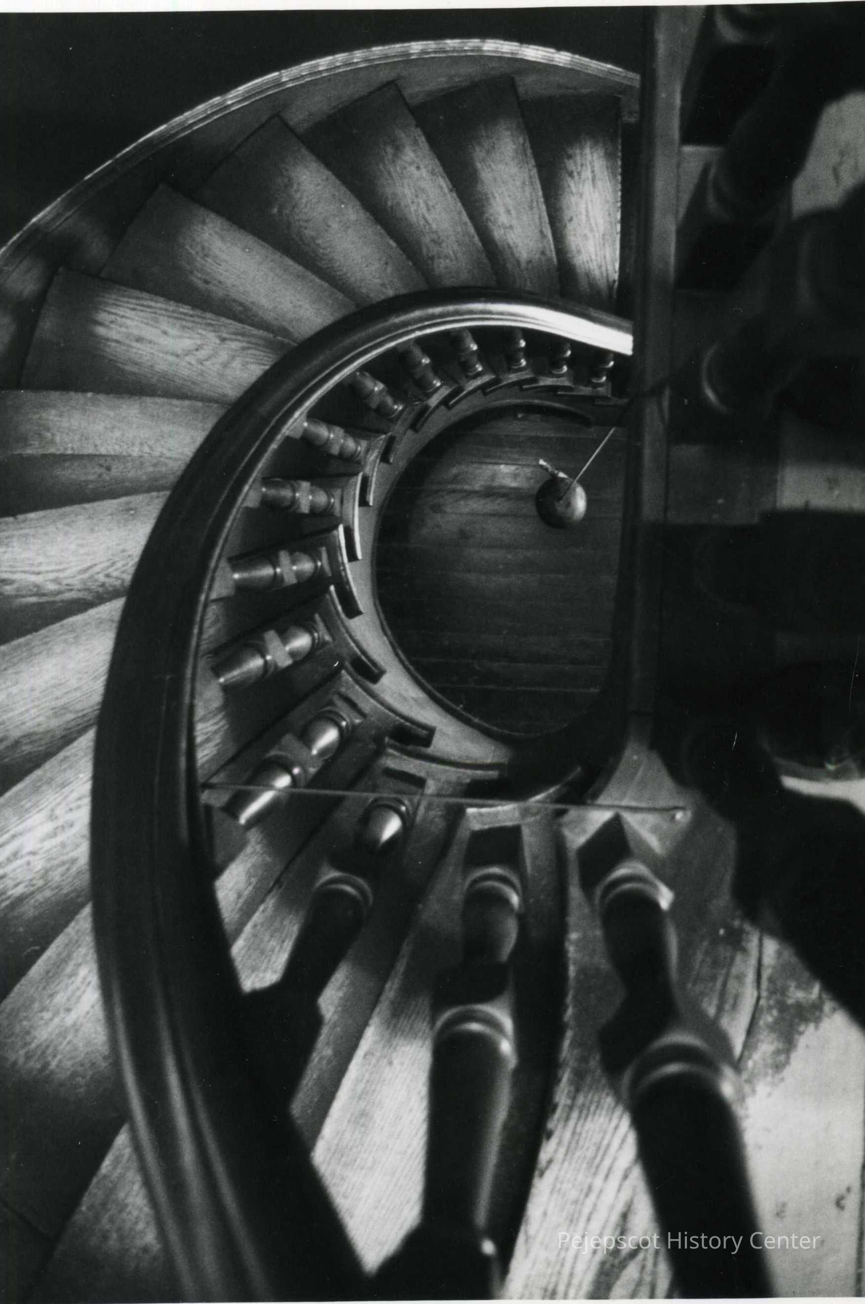 B/W photo of the curved staircase in the Joshua L. Chamberlain Museum, Brunswick. ME. The view is from the second floor looking down. No date.