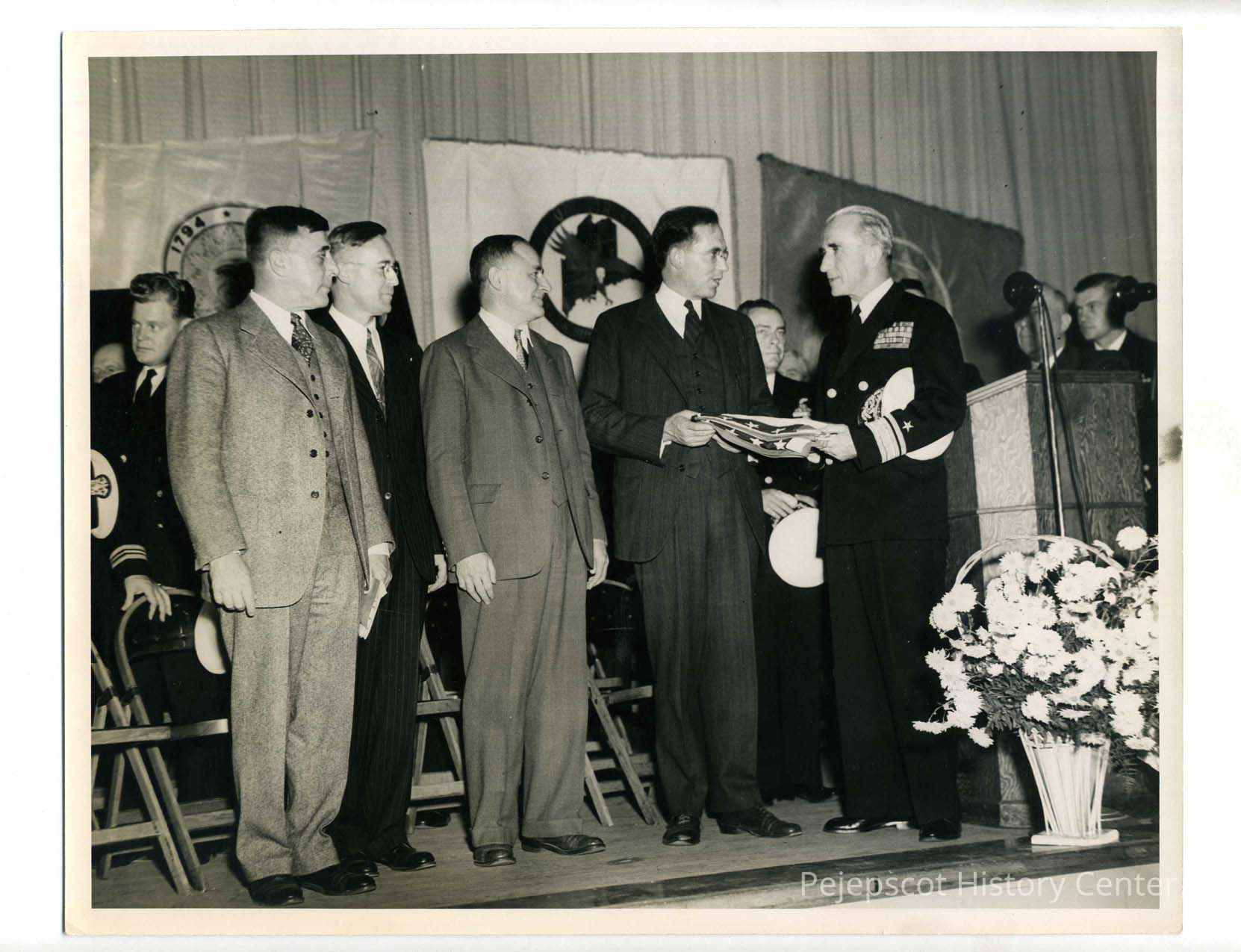 The same ceremony as in picture 1990.156.1232. Here four civilians stand to the left of the podium. Three civilians watch as a folded American flag passes between the fourth civilian and a Naval officer. Undated