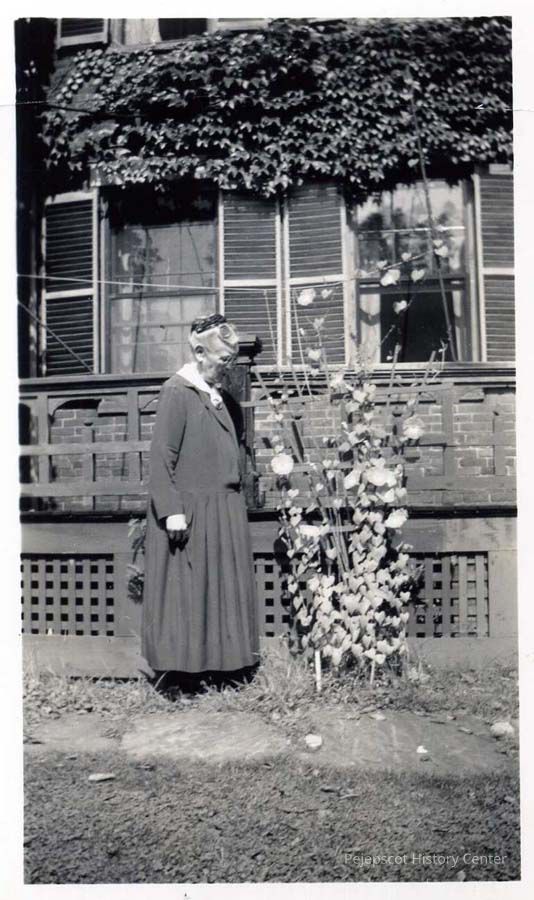 B/W photo of Miss Clara Owen and her "Heavenly Blue" morning glory.