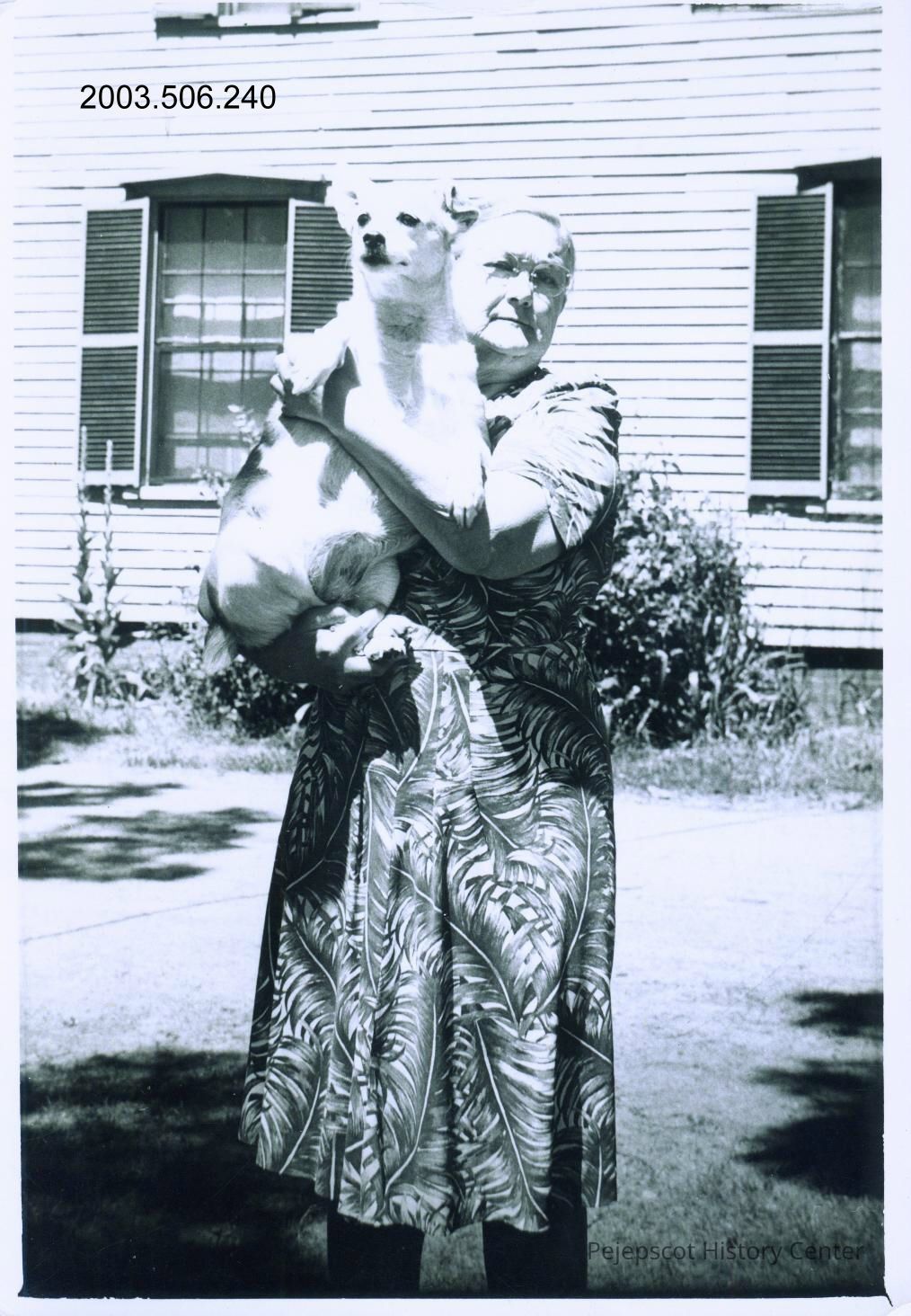 An undated black and white photo of Clara Woodward from Pejepscot (Topsham, Maine,) and her dog, Betty.