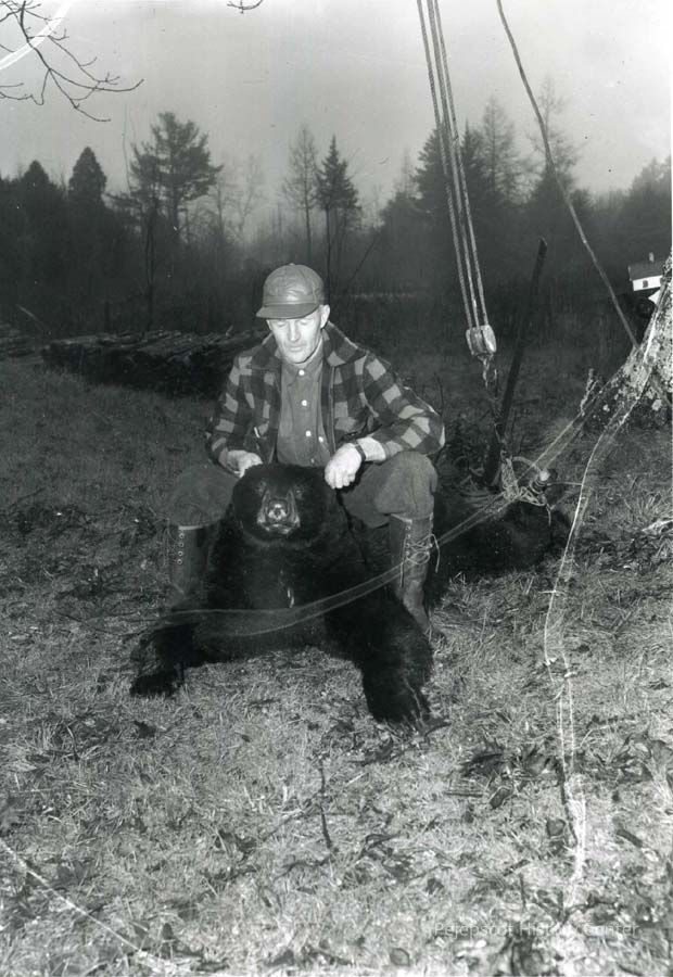 Black & white photograph of Clarence Skolfield showing off black bear he shot November 20, 1954.