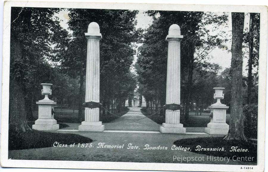 Black & white postcard of the Class of 1875 Memorial Gate at Bowdoin College.