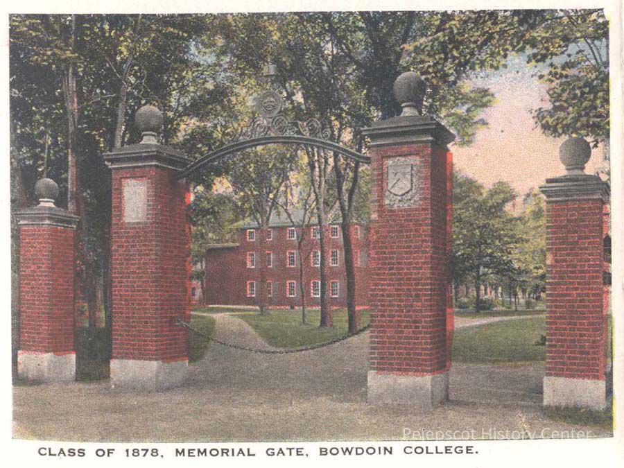 Postcard view of Class of 1878 Memorial Gate, Bowdoin College, Brunswick, Maine. Date unknown.