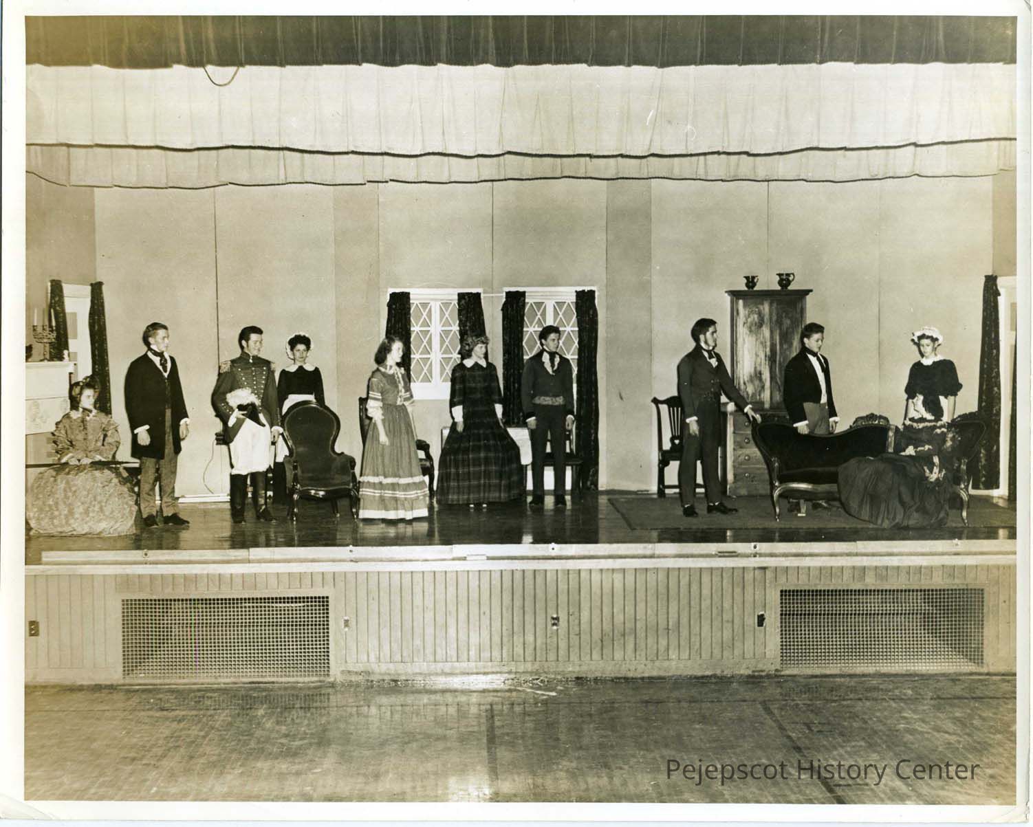 The cast of "Little Women" are pictured on the stage in full costume. This was the class play of 1946. Undated