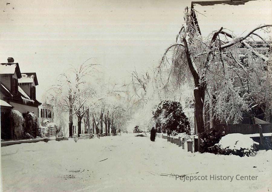 A B/W photo of Cleavland Street , Brunswick, ME during an ice storm. The street is covered in snow and branches have come down from the tree in the foreground. Dated 1885.