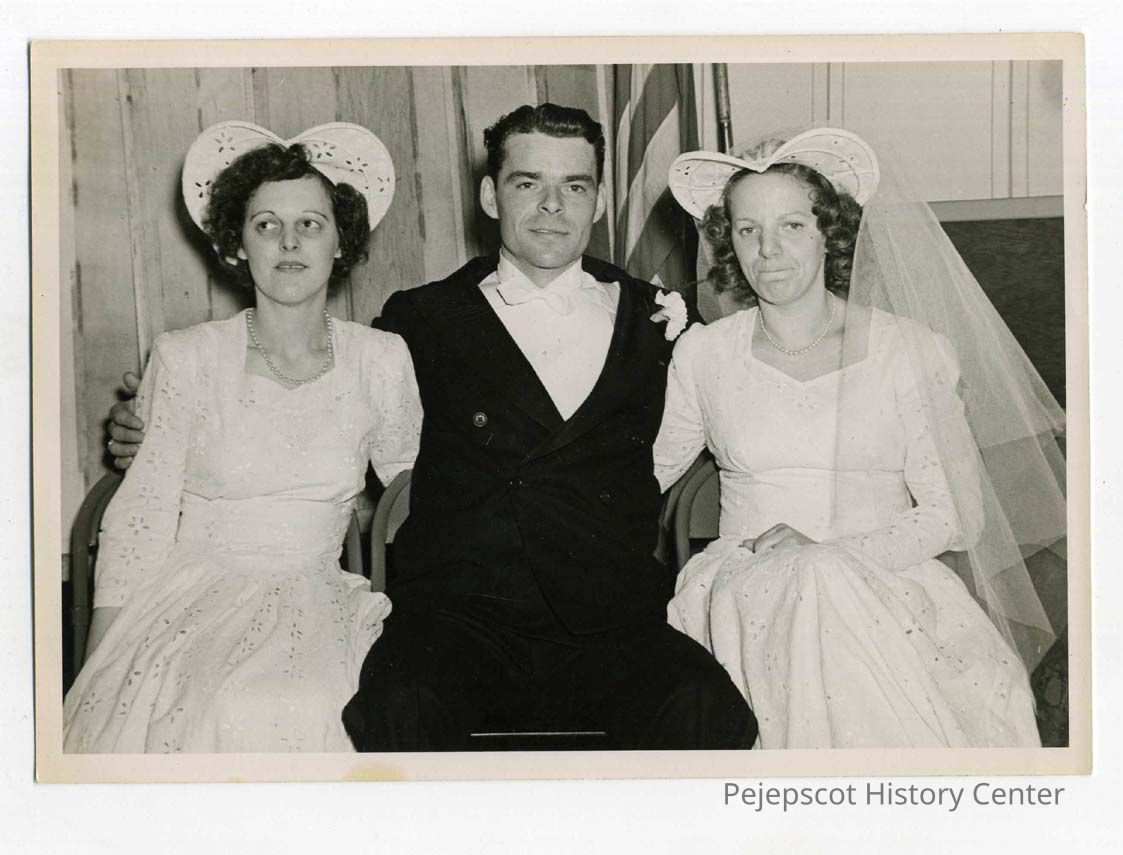 Helene Cloutier and Robert Joseph Labbe with their matron of honor Cyrienne Cloutier Belanger. 06/03/1946