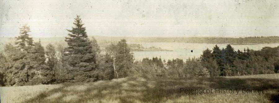 A B/W photograph of a coastal view of Harpswell, ME. The line of trees gives break to the ocean. Undated.