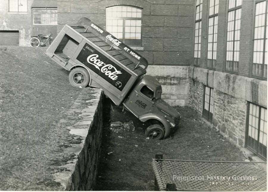 A black and white photo of a Coca-Cola truck in an accident on March 25, 1942, with the Cabot Mill in the background. The photo is stamped in the left bottom corner "Cloutier's Studio, Brunswick, Maine". Brunswick, Maine.