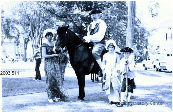 An undated black and white photo of an unknown man on horseback with an unknown woman and two unknown children standing by the horse. All are in colonial attire. The photo may have been part of a U.S. Bicentennial observance in 1976. The Brunswick, Maine, Mall is in the background.