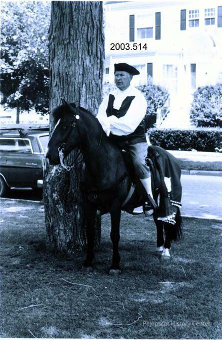 An undated black and white photo of a man in colonial attire who may be Barrett Parker sitting on a horse on the Brunswick, Maine, Mall. Park Row is in the background.