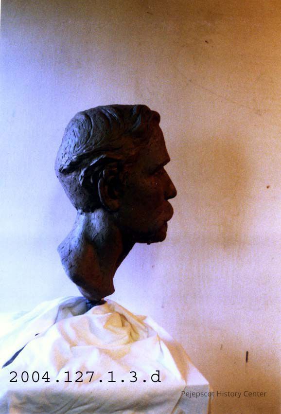 Color photograph of a "life-size portrait," of the J.L. Chamberlain's head done in clay. It is part of a group of 4 color photographs of the model glued to a piece of white paper.