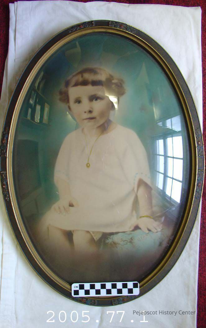 A colorized photographic portrait print of Velma Gaudreau (donor's mother) as a young child.