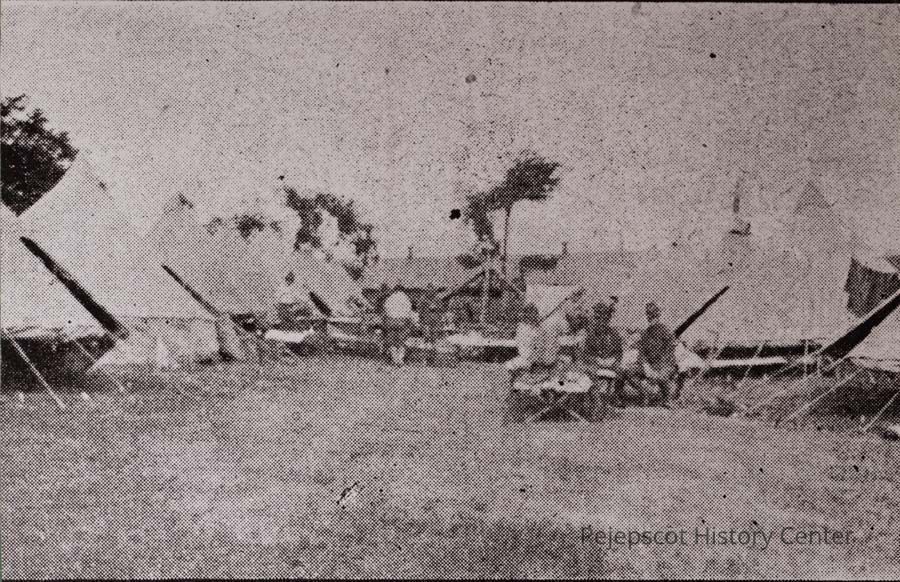A B/W photographic reproduction of the "company street before inspection." The photo depicts Brunswick's National Guard unit the (10th Co.) in Camp Preble, Portland during WW I. undated