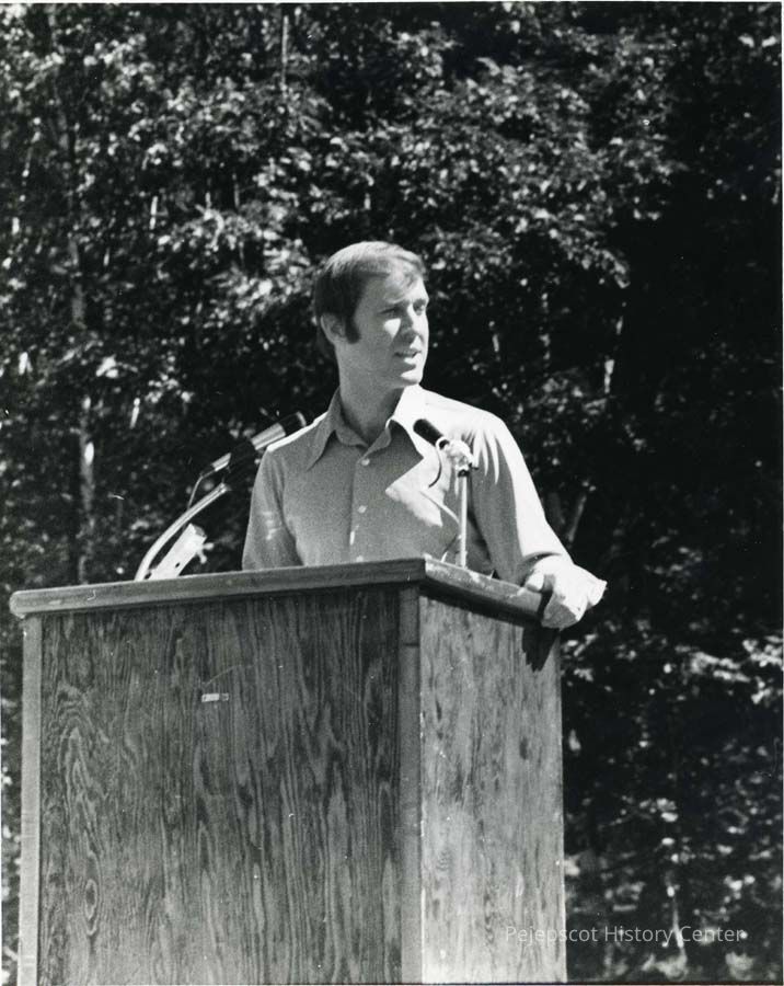 Photo of Congressman William Cohen speaking at the commemoration of the 50th anniversary of the "Around the World Flyers" at Monument Rock, Mere Point ,Brunswick, Maine, 1974.