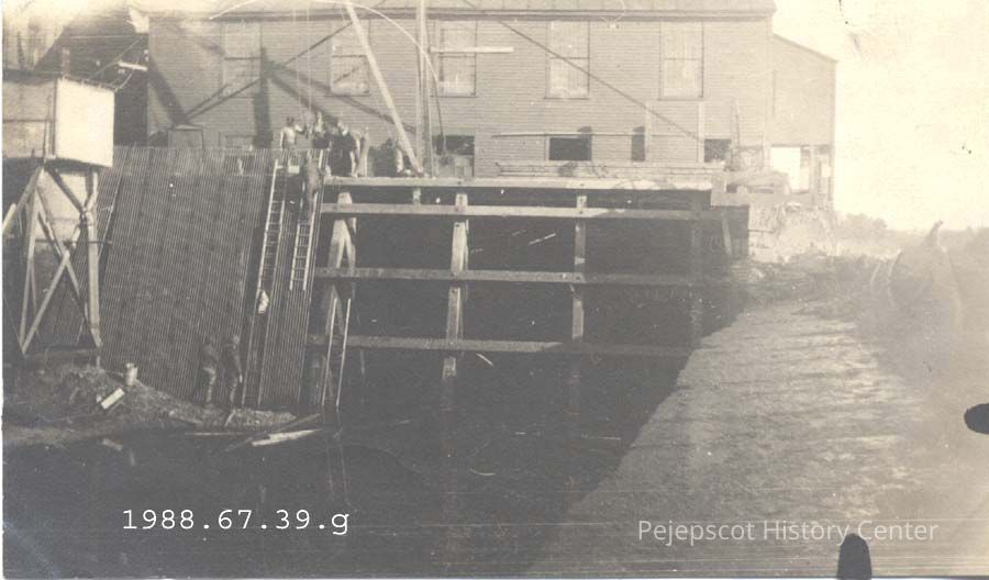 A B/W photograph of construction at the Pejepscot Paper Co. mill at Lisbon Falls, Maine. The workmen are constructing the dam. In this photo you can see the canal.