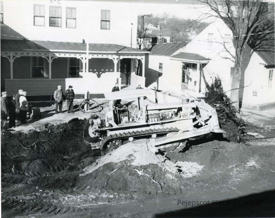 B/W photo of a bull dozer removing a stump, to make way for the new Route 1 to Cook's Corner. No date.