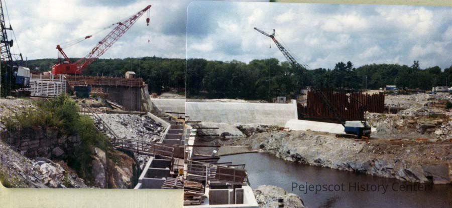 Two color photos laid together to create a panoramic view of the nearly finished dam and fishway. Undated