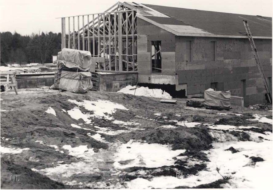 A B/W photograph of the construction of the new United Methodist Church on Church Road. Undated