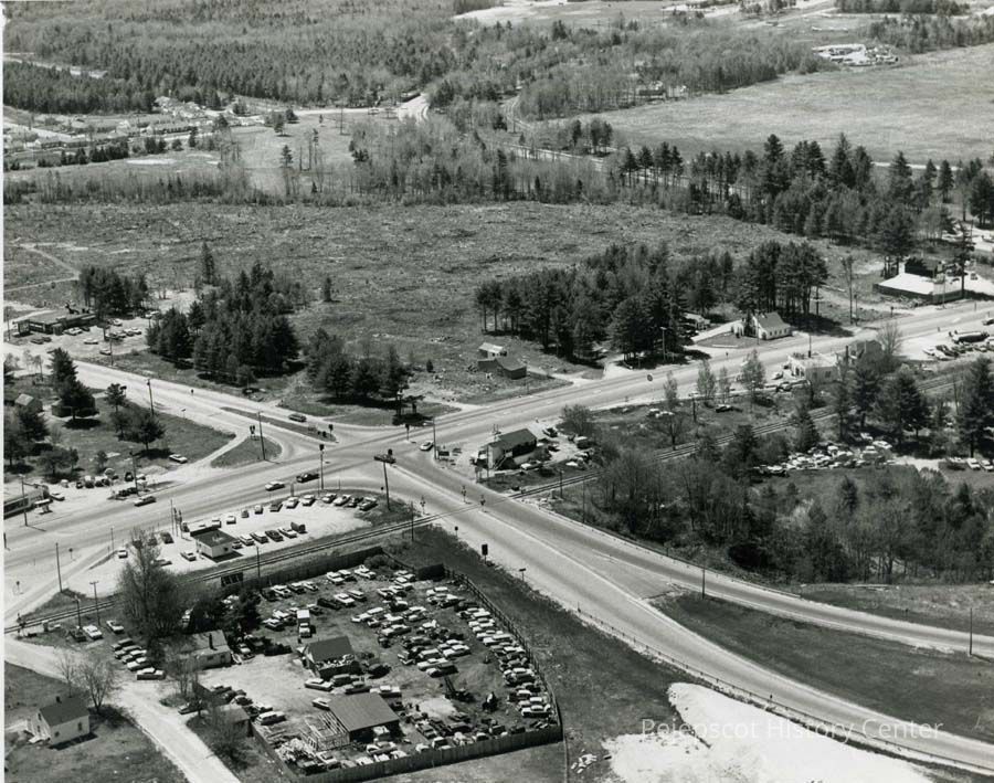 A B/W photograph of Cook's Corner, Brunswick, ME, prior to development. Dated c. 1960's.
