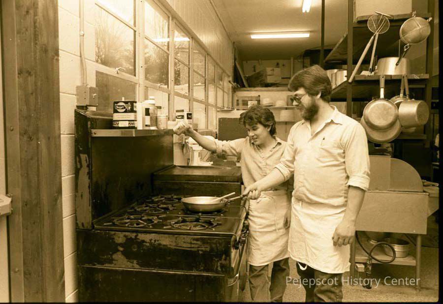 An undated photo of the Copper Kettle Restaurant in Brunswick, Maine, with two unknown cooks.Collection