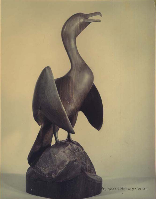 A color photograph of a sculpture of a Cormorant. It is carved out of ebony wood. It was carved by Charles G. (Chippy) Chase. It is 20 inches tall. No. 213. Undated