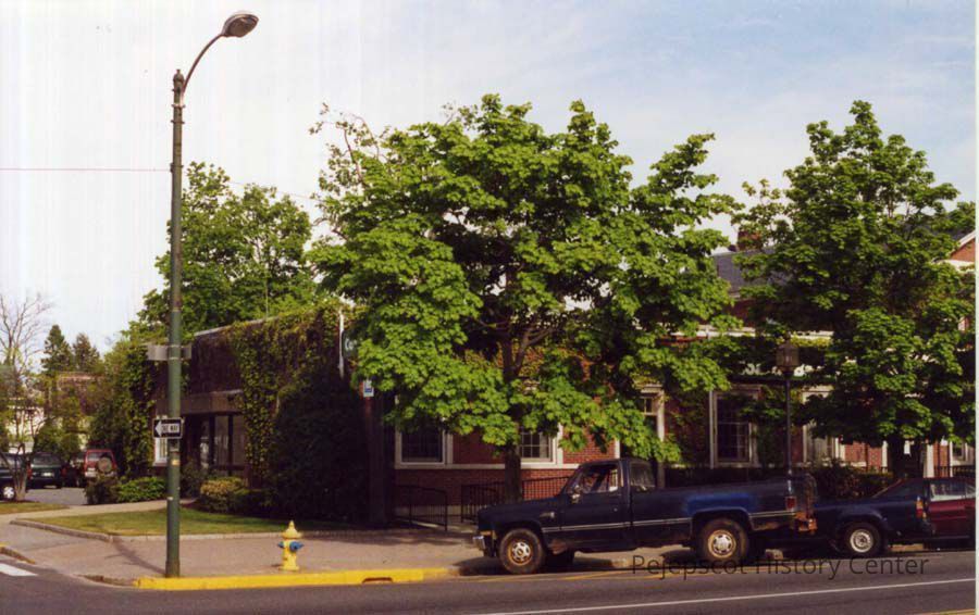 Color photo of the corner of Maine and Bank Streets, Brunswick, ME. In 2001, Coastal Bank occupied the space. No date.