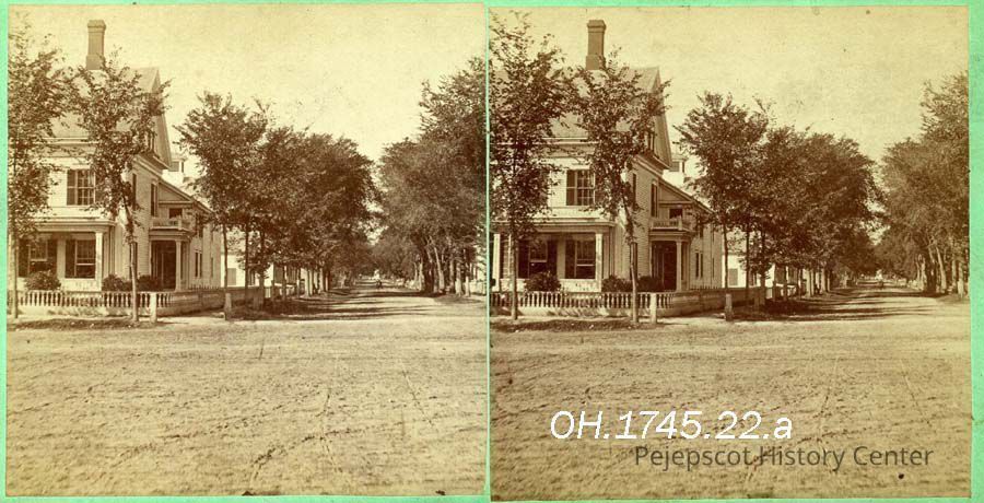 A stereo view photo of the corner of Maine and Pleasant Street, Brunswick, ME. Not dated.