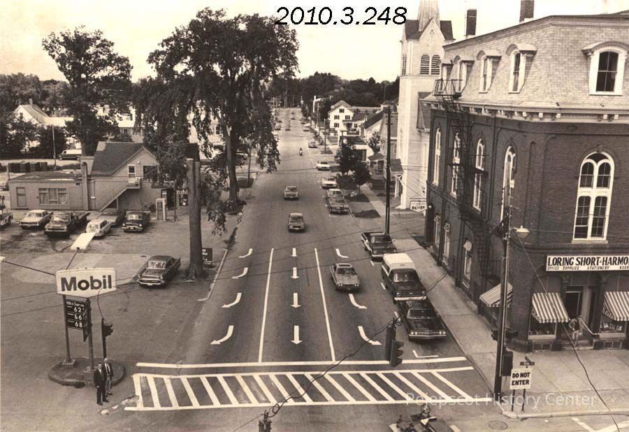 A B/W photograph of the corner of Maine and Pleasant Streets. Photo published 6/21/1977. Undated