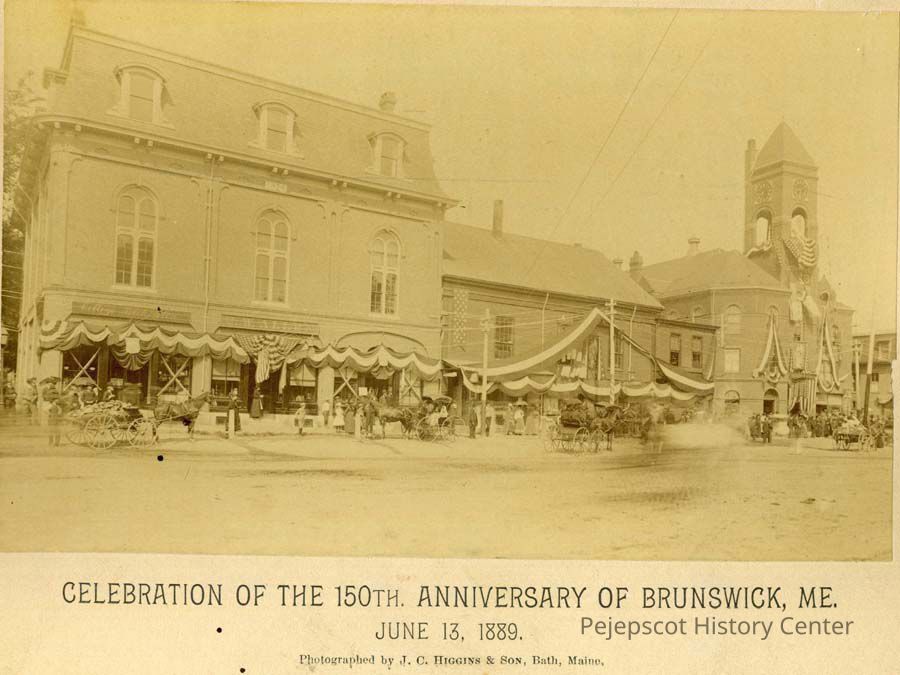 Brunswick, 150th Anniversary - Brunswick, Celebrations - Brunswick, Celebrations - 150th Anniversary of Brunswick, Anniversaries - Brunswick, Store fronts, Stores - Brunswick, Horses, Carriages and carts, Bunting, Knights of Pythias Building, C. W. Allen Drug Store, College Book store, Businesses - Brunswick, Streets - Maine, Town Hall - Brunswick, Old Town Hall