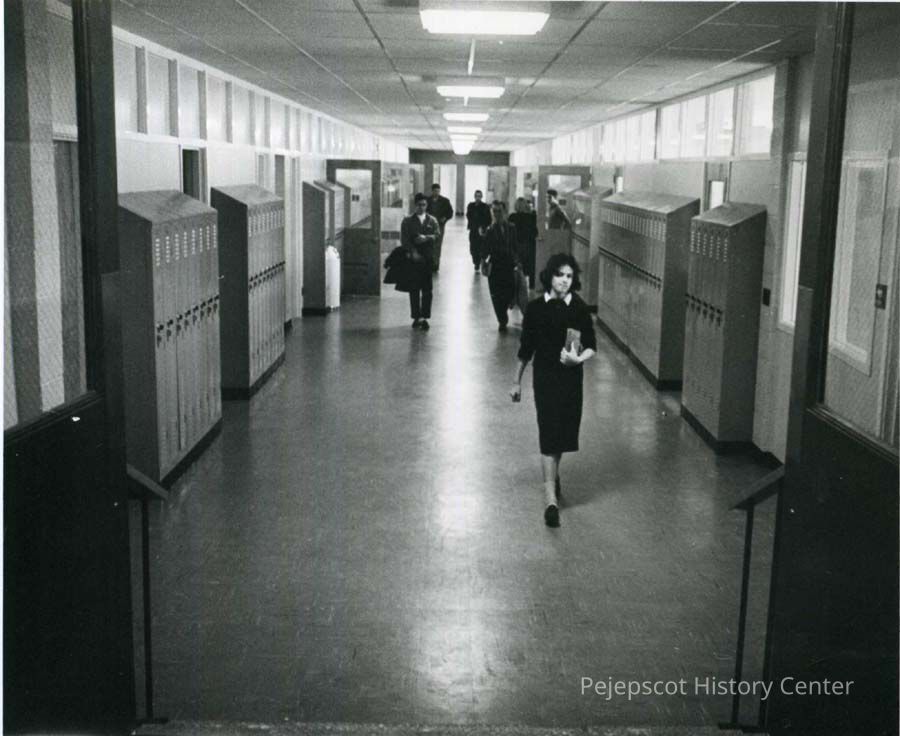 A B/W photograph of the corridors at Brunswick High School, 38 Spring Street, Brunswick, Maine. Building no longer extant. Dated c. 1962.Collection