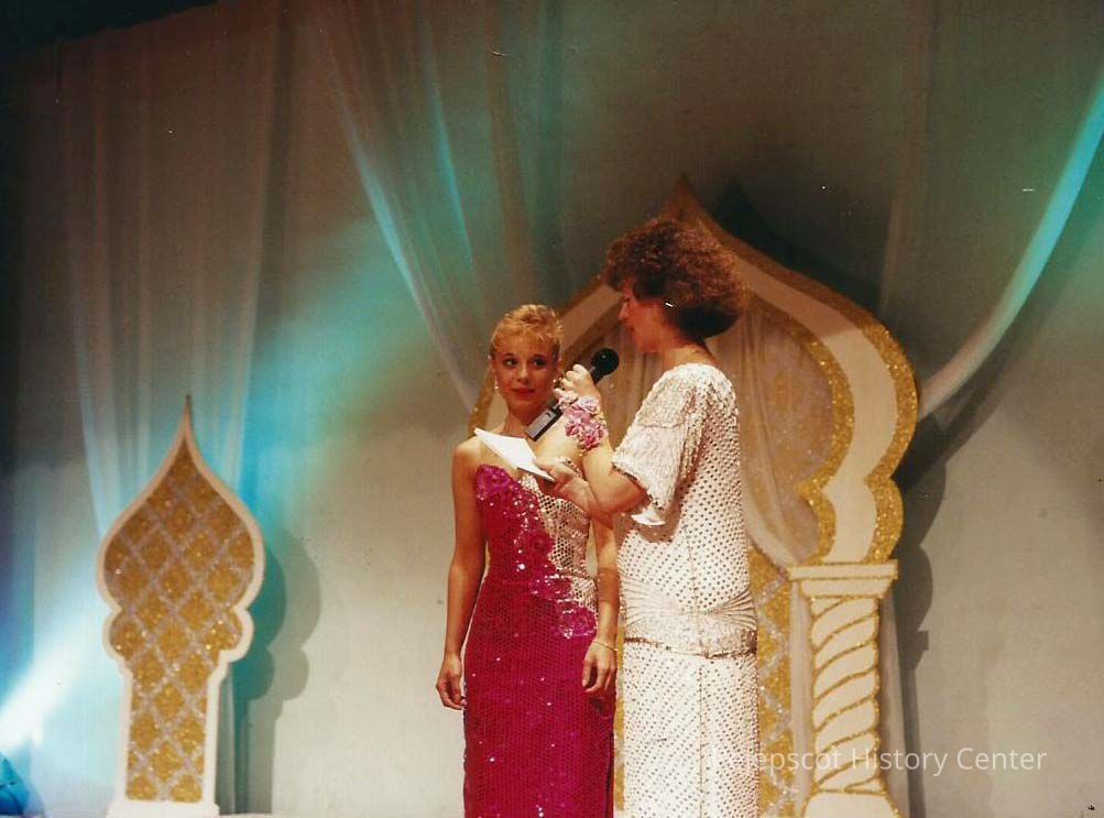 A color photograph of Sharon asking Corrie Pottle, "How does Alzheimer Disease affect the care giver?" Photographers # 4-28 CYO sponsored