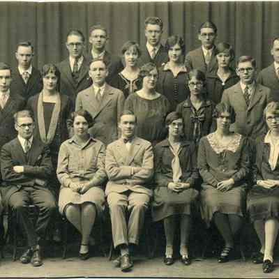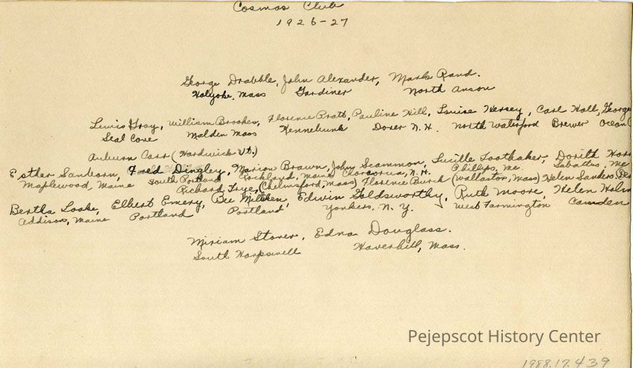 A black and white photograph of members of the 1926-1927 Cosmos Club at Bates College. The names of the individuals in the photo are listed on the back.