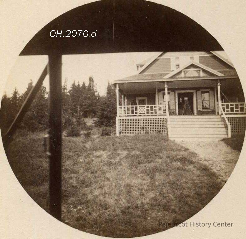 A B/W photograph of a cottage at Mere Point, Brunswick, ME. Dated 8/1889.