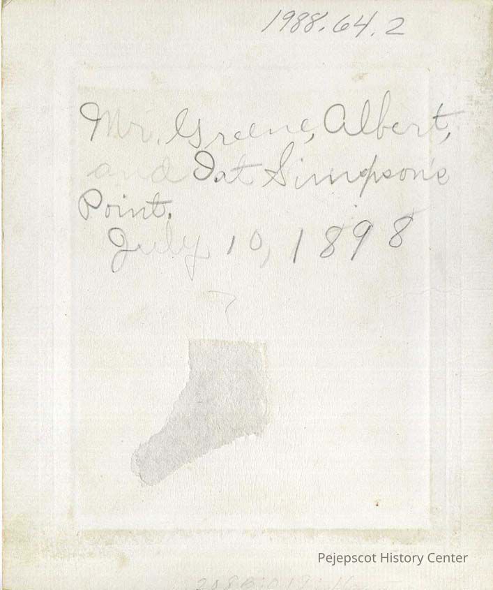 Cottage at Simpson's Point. According to the accession record, this hand-written description may in fact mistakenly appear on the back of 64.1, which is a picture of three men at Simpson's Point.
