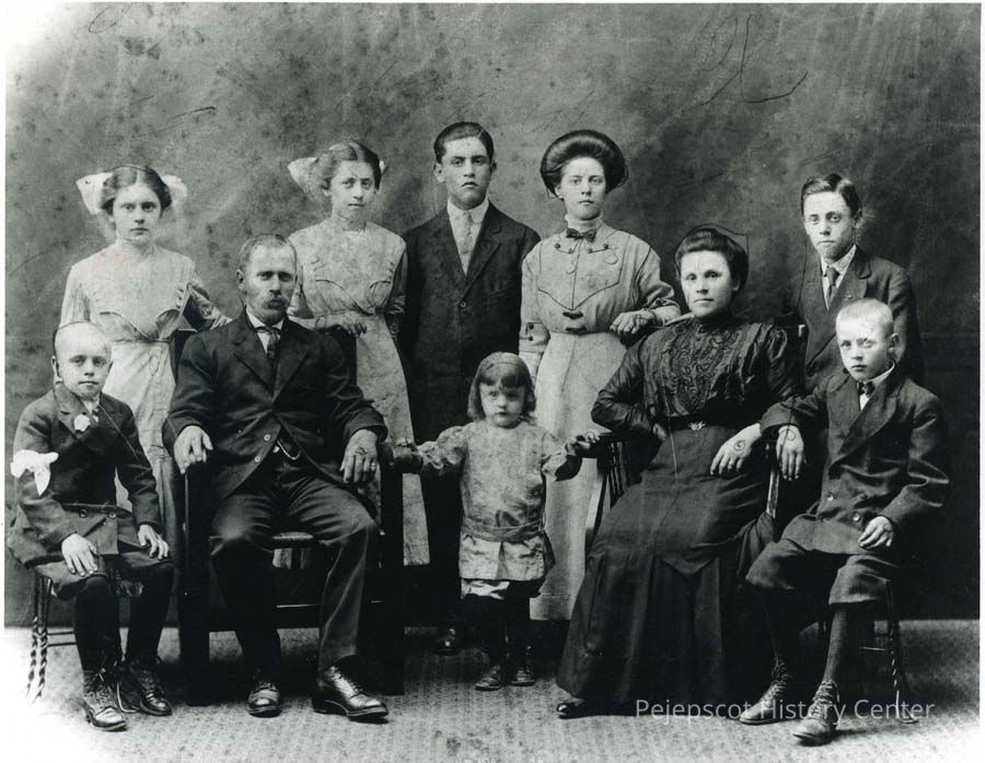 B/W reproduction of photograph of Coulombe Family. Standing L to R: Mom Lucia Coulombe, Aunt Emilia, Uncle Ludger, Aunt Laura (Norman), Uncle Albert ; Front - R: Uncle Oscar, G.F. Joseph, U. Adolphe, Grandmother Eva (Paradis), Uncle Edward.Lexicon