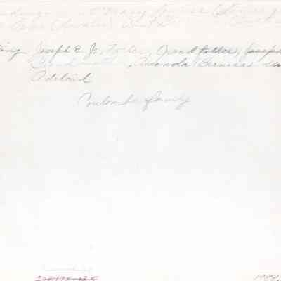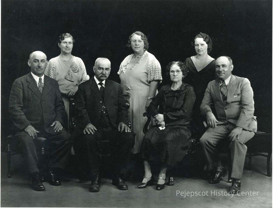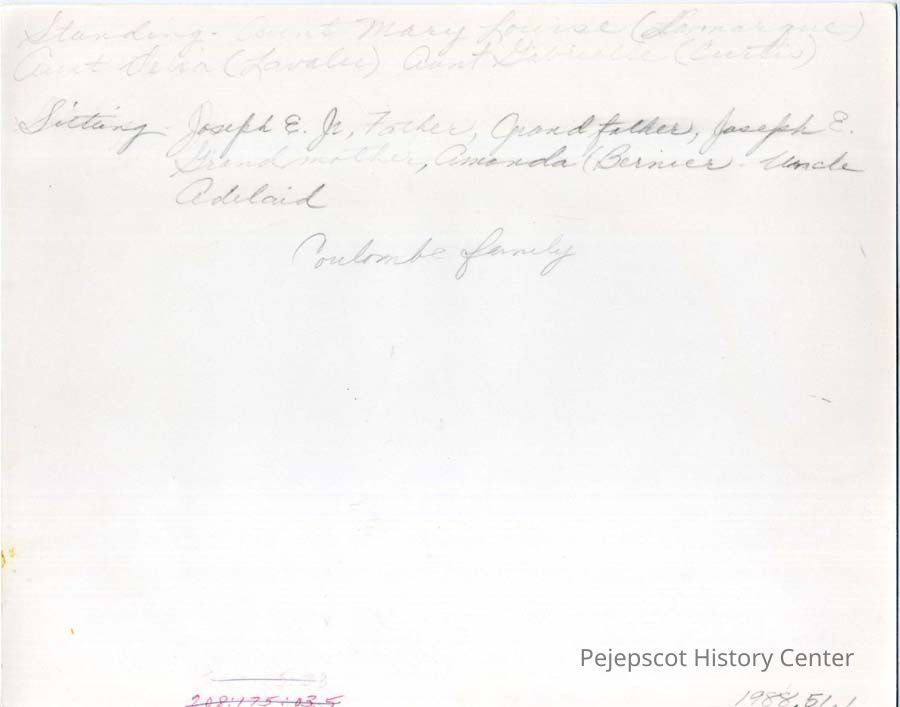 B/W reproduction of photograph of Coulombe Family. Standing: Aunt Mary Louise (Lannarque), Aunt Delia (Lavallee), Aunt Gabrielle (Curtis); Sitting: Joseph E. Jr., Father, Grandfather Joseph E., Grandmother Amanda (Bernier), Uncle Adelaid.