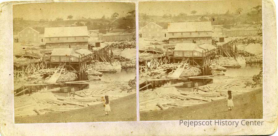 A sepia toned stereoptican view of the Cove Mill on the Androscoggin River in Brunswick, taken from Water Street. A young girl stands looking at the mill. The reverse reads: "Maker Geo. W. Barnes" "Views of Brunswick and Topsham", and includes a list of Barnes' views pasted on the back (see Image Management).