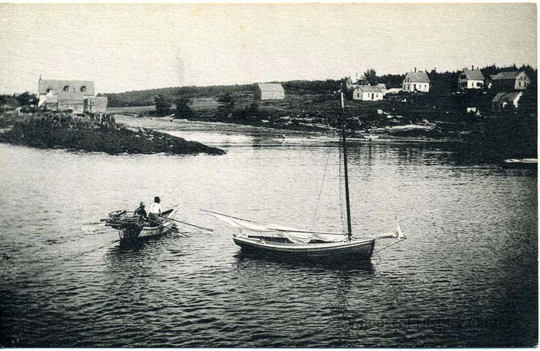 An undated black and white postcard showing the view of a cove on Orr's Island, Harpswell, Maine. There are boats in the water and houses along the shore.Lexicon